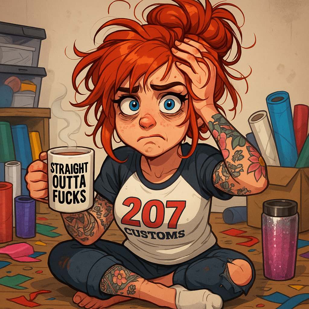 207 Customs is rollin’. Orders flying in, DMs popping off, and I’m over here trying to find the heat press under a pile of tees and lost sanity. You ever try weeding decals while a feral child is yelling about Minecraft and the dog’s barking at a squirrel ghost? Add in the fact I’ve had zero sleep and an unhealthy attachment to Red Bull, and that’s the current CEO situation.