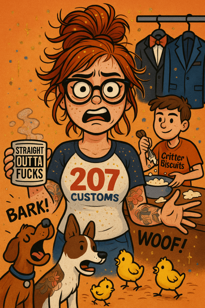 So yeah. Between running 207 Customs, launching Critter Biscuits, surviving prom prep, battling the Bark Police, and breathing in poultry dust like it’s my side hustle—I’m somewhere between thriving and needs wine in an IV.